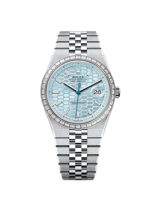 Rolex Land-Dweller 127386TBR-0001 Blue Honeycomb Dial Diamond Platinum Jubilee Bracelet 40mm