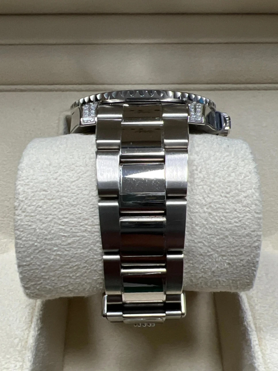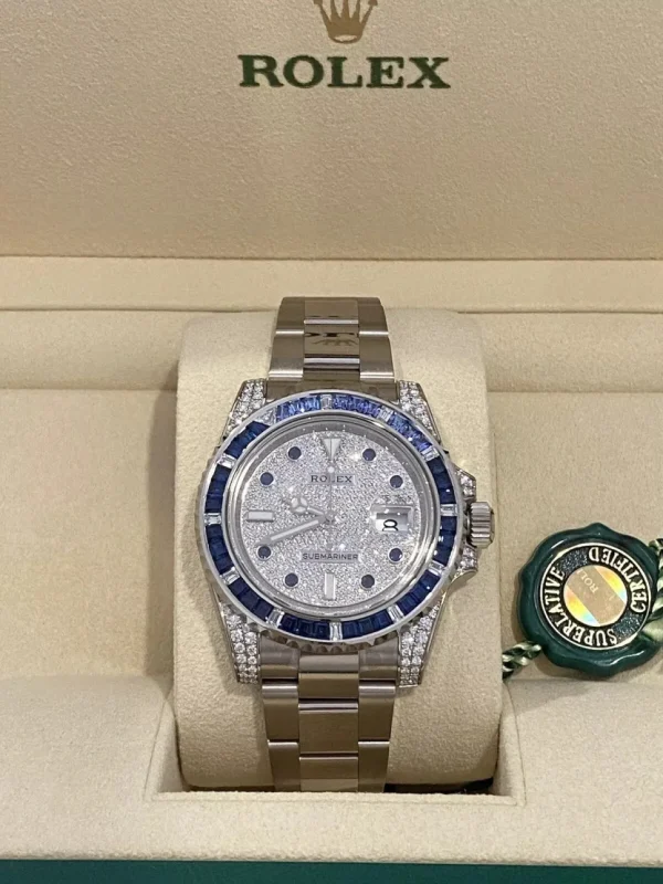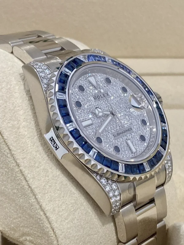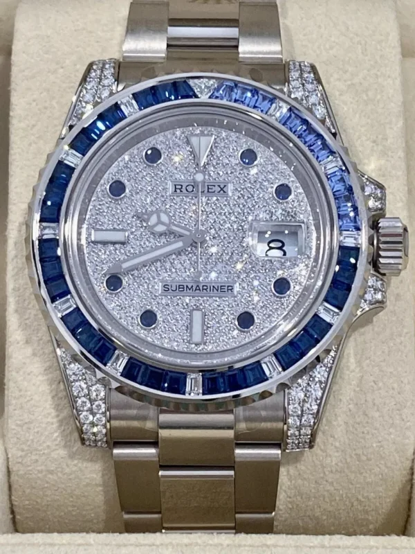 Rolex Submariner Automatic Chronometer Saphire Set Diamond Watch 116659SABRO18kt white gold case with a silver-tone 18kt white gold bracelet, Blue diamond set bezel. Pave dial with index hour markers, Minute markersaround the outer rim. Dial Type: Analog. Luminescent hands and markers. Date display at the 3 o’clock position, Rolex Calibre 3135 Automatitmovement, containing 31 jewels, bitting at 28800 vph, and has a power reserve of approximately 48 hours, Sratch resistant sapphire crystalScrew down crown, Solid case back, Round case shape, case size:40 mm, Ovsterlock clasp, Water resistant at 300 meters / 1000 feet Functionsdate, hour, minute, second, chronometer. Submariner Series. Dive watch style. Watch label: Swiss Made. Rolex Submariner AutomaticChronometer Saphire Set Diamond Watch 116659SABRO