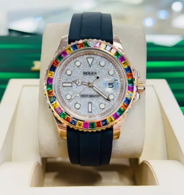 Rolex Oyster Perpetual Yacht-Master 40 mm 18k Everose Gold with Bidirectional Rotatable Gem-Set Bezel features 32 Sapphires, 8 tsavorites and one Diamond and Diamonds Pave Dial with Everose Gold Luminous Hands and Luminous Hour Markers. Oyster case is Stainless Steel with Screw-Down Crown and antireflective Sapphire Chrystal with Magnifier – Cyclops Lens. The date indicator located on 3 o’clock. The watch has Matt Black Oysterflex bracelet with 18k Everose Gold Oysterlock.
