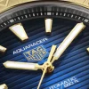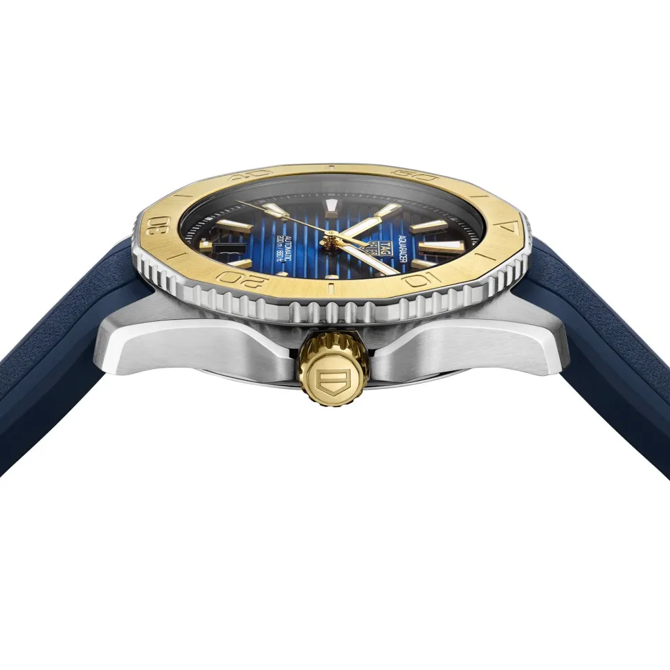 This Aquaracer model pairs the elegant 40mm steel case with a sporty dark blue rubber strap featuring a steel buckle and comfort extension link for ultra-versatile and comfortable styling. A yellow gold screw-down crown compliments the tones of the bezel.