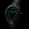 Finished with a horizontal pattern, the dial features luminescent hands and hour markers for legibility in even the most extreme environments. A date display at 6 o’clock further enhances functionality.