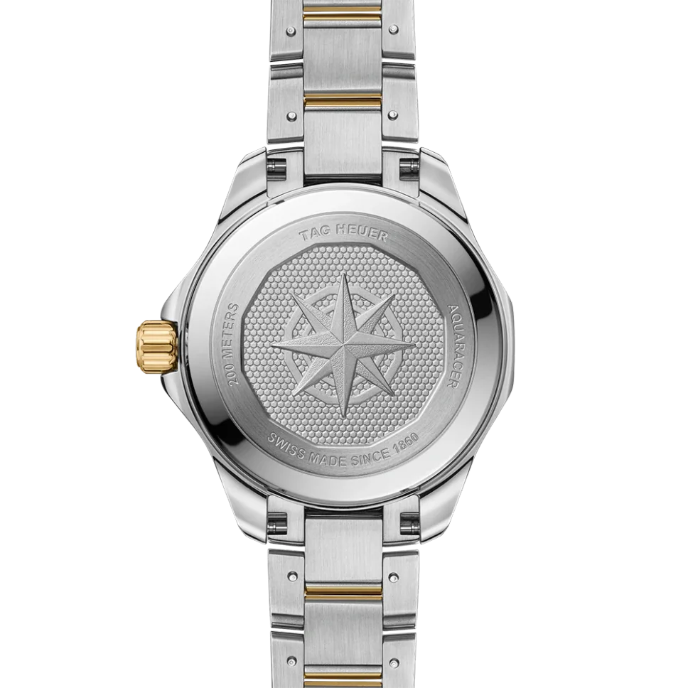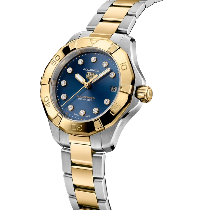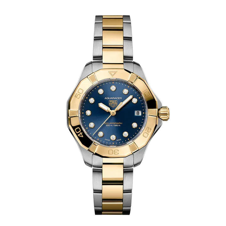 SKU2-038-02-0271Model NumberWBP1323.BB0004ManufacturerTAG HeuerManufacturer Warranty2 YearsConditionNewProduct TypeWatchRangeAquaracerPackagingTAG Heuer Presentation PackagingReturn Policy14 DaysMovementSolar QuartzDisplay TypeAnalogue and DateDial ColourBlueDial MarkersDiamondsGlass TypeSapphire CrystalWater Resistance200 MetresCase Width (mm)34.00Watch Clasp TypeFolding ClaspWatch Strap TypeMetal BraceletWatch Strap DetailsFine-Brushed/Polished Steel, Folding Clasp Double-Security – SteelWatch Case MaterialStainless Steel & GoldFeatures11 x Diamonds, Dial Diamond Weight 0.155, Screw-down 18K 2N yellow gold platedBezel TypeTurning Bezel Steel 18K 2N Yellow Gold Plated