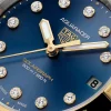 The blue sunray brushed dial contrasts beautifully with the brilliance of 18K yellow gold plated elements. Framed by a gold plated bezel and adorned with 11 shimmering diamond indexes, the dial’s vibrant tones and polished materials create a bold, eye-catching allure.