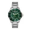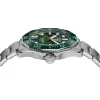 The robust green ceramic unidirectional bezel displays a 60 minute scale, while the deep green sunray brushed dial plays host to luminescent hour minute hands and indexes, a date display at 6 o’clock, and a vivid lime seconds hand.