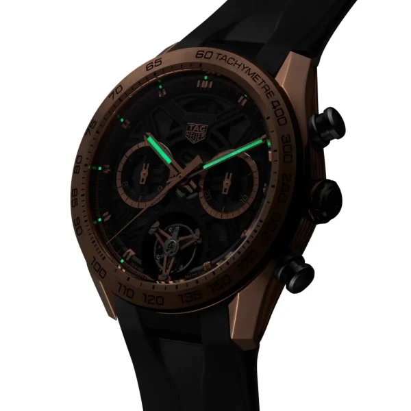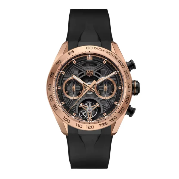 Embrace the fusion of luxury and performance with the TAG Heuer Carrera Chronograph Tourbillon, a striking embodiment of motorsport passion. With its prestigious blend of 18K 5N solid rose gold and Grade 2 titanium, this timepiece redefines the essence of high-end sports watches.
