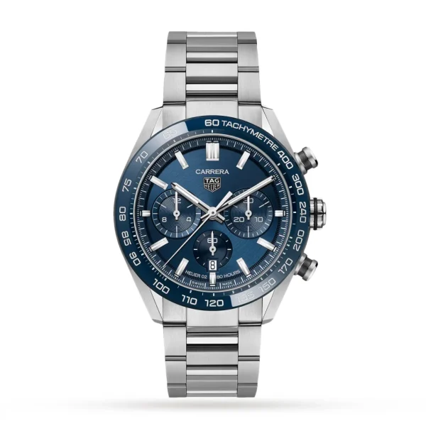 Driven by the Heuer 02 calibre automatic movement, this sophisticated timepiece boasts a distinct sense of style, with an elegant blue dial framed by a classic blue ceramic bezel.