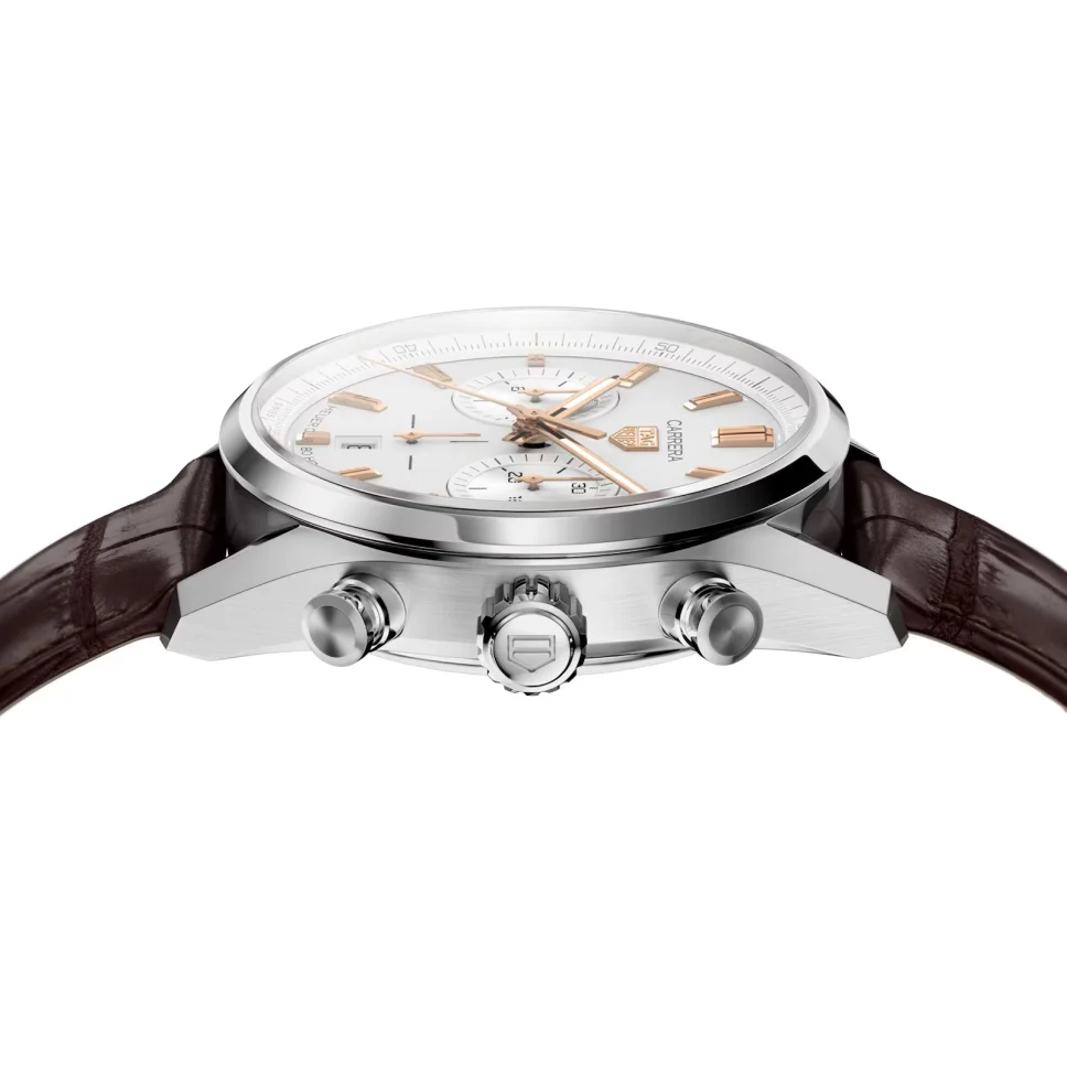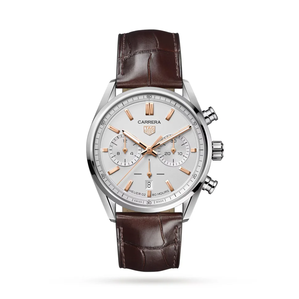 Driven by the Heuer 02 calibre automatic movement, this sophisticated timepiece boasts a distinct sense of style, with a luxurious silver sunray dial enhanced by 5N rose gold hands and hour markers.