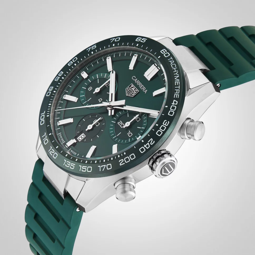 Driven by the Heuer 02 calibre automatic movement, this sophisticated timepiece boasts a distinct sense of style, with a contemporary, green brushed dial punctuated with three green chronograph counters.