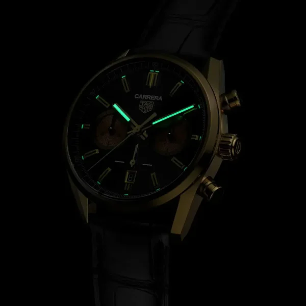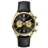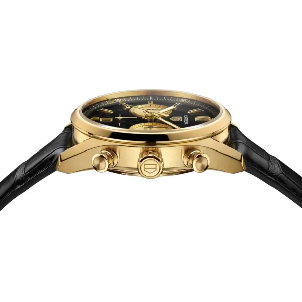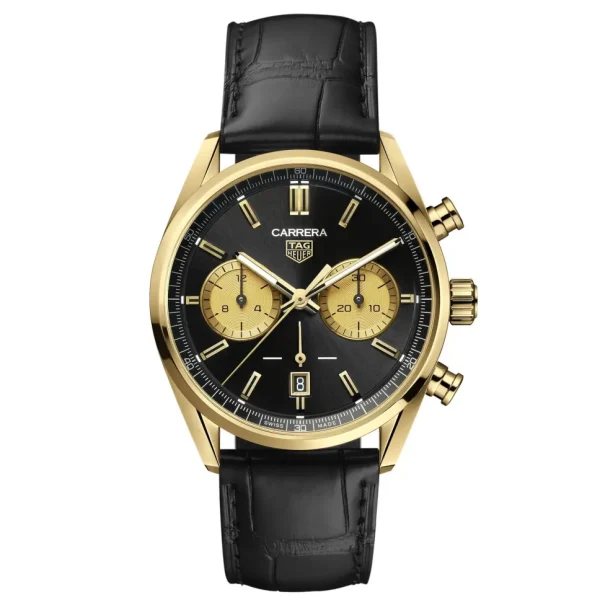 DescriptionIn a stunning black and 18K 3N yellow gold execution, this TAG Heuer Carrera Chronograph takes inspiration from an iconic racing livery to reinforce the collection’s connection to motorsport. Inspired by the Maison’s legendary designs like an inverted version of the famed Heuer reference 1158 CHN, this 42mm 18K 3N yellow gold chronograph will overcome any challenge in style. The black sunray brushed dial is given an edge of striking luxury with the 18K 3N plated yellow gold chronograph counters, hour markers and hands. Visible through the clear case back, the in-house Calibre Heuer 02, a column-wheel chronograph, shows a black oscillating mass.