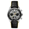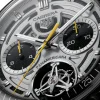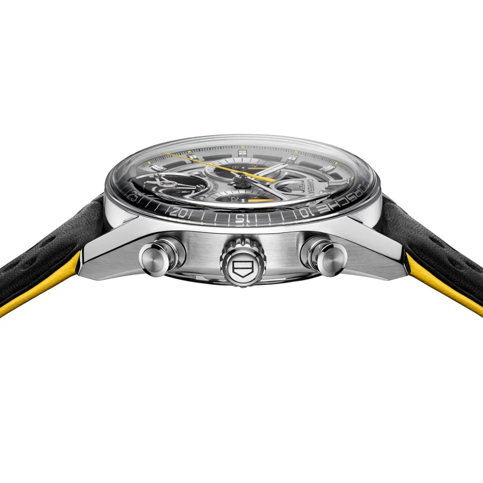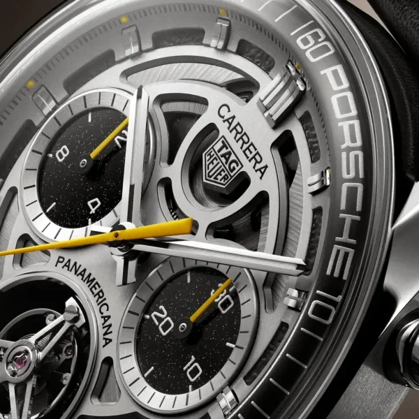 Dial: Silver skeleton dial with a black, 60 minutes/seconds track, flange marked “Porsche”, echoing a dashboard style. Rhodium-plated luminescent baton hands and index hour markers. Yellow lacquered central chronograph hand. Two chronograph subdials — 30-minute register at 3 o’clock and 12-hour register at 9 o’clock. Tourbillon 1-minute cage at 6 o’clock, featuring a three-spoke design reminiscent of the Porsche 550 Spyder steering wheel.