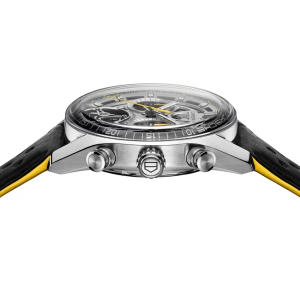 Case: Stainless steel round case 42.0 mm in diameter. Transparent exhibition sapphire crystal caseback. Two pushers operate the chronograph functions. Tag Heuer logo on the fluted screw-down crown. Engraved on left side of the case “Spyder”, to honor the anniversary of Porsche’s iconic 550 Spyder class win in the legendary 1954 Carrera Panamericana race.