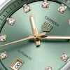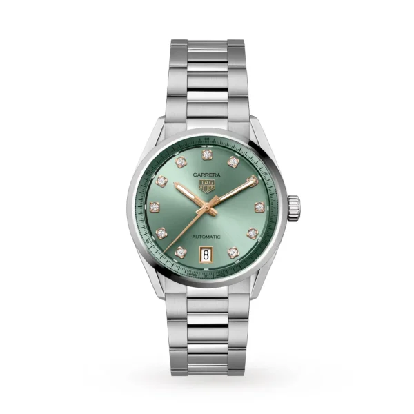 Introducing the TAG Heuer Carrera Date, presented in a 36 mm steel case with a green sunray-brushed dial. This watch redefines modern sophistication. The dial, in a subdued pastel-like green, is set with 11 VS diamonds totaling 0.22 ct that bring a subtle sparkle, complemented by rose gold-plated accents for a refined look.