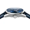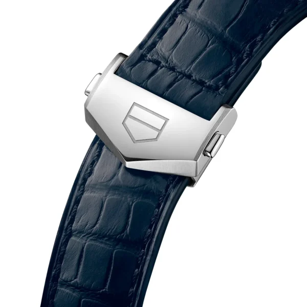The striking blue dial creates a high contrast backdrop for the luminescent rhodium-plated hands and indexes, ensuring visibility in all conditions. A clear date display sits at 6 o’clock.