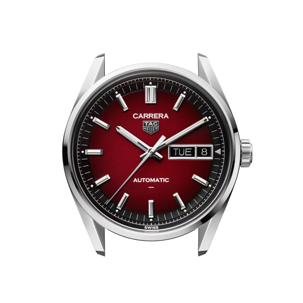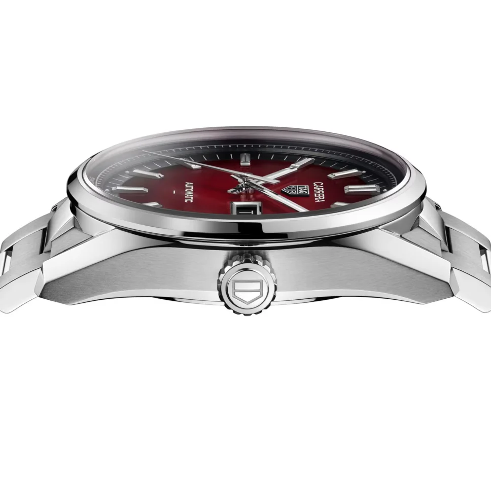 Add a bold touch to your collection with the TAG Heuer Carrera Day-Date in smokey red. The TH31-02 movement provides an 80-hour power reserve, while the eye-catching 41mm design features a striking opalin dial, polished H-bracelet, and practical day-date display, combining modern style with precision. On the caseback, the engraved Victory Wreath is a symbol of triumph.