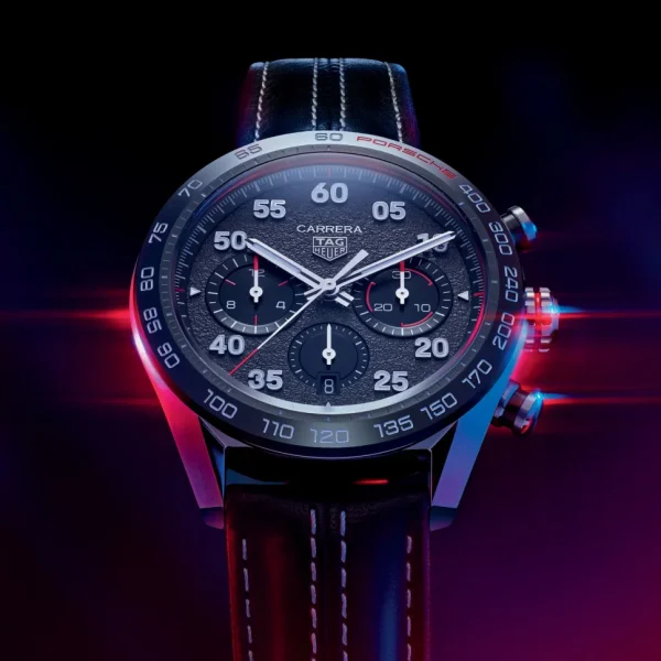- Driven by the Heuer 02 manufacture movement with a Porsche-inspired oscillating mass