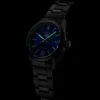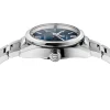 The blue sunray brushed dial presents bold rhodium-plated hands and indexes, both filled with Super-LumiNova® for improved legibility, as well as a date display at 6 o’clock.
