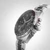 Presented within a 44mm polished steel case, the striking dial is complimented by a monochrome printed TAG Heuer logo, while the durable black titanium carbide-coated steel bezel features a striking white tachymeter scale and bold red lettering.