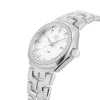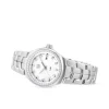 Framed by a glistening diamond-set bezel, the white mother-of-pearl dial is distinctly feminine, with 12 glistening diamond hour markers reflecting the light from every angle.