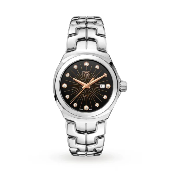 - Striking black dial with radial sparks and glistening diamond indexes