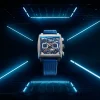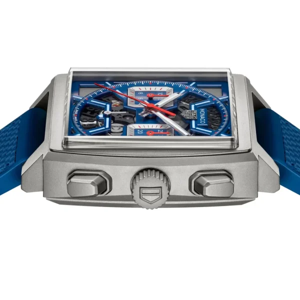 The skeletonised blue sandblasted dial is home to two chronograph complications, highlighted by titanium outer edges and vivid red lacquered hands.