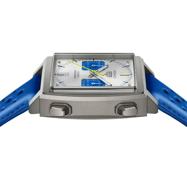 This 39mm model is presented in a square-shaped titanium grade 2 case, secured by a versatile racing blue calf leather strap.