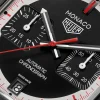 The black and silver-grained dial features a vivid red central hand and a single red lacquered index at 12 o’clock, recalling the designs of emblematic Heuer stopwatches from the 1960s & 70s. The applied indexes and blue Super-LumiNova® hands bring clarity in all conditions.