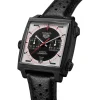 Secured by a perforated black calfskin strap, the TAG Heuer Monaco Chronograph Stopwatch channels classic racing aesthetics, while the titanium buckle emblazoned with the HEUER logo reinforces the watch’s rich legacy.
