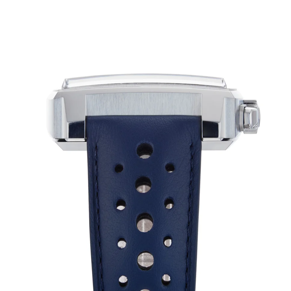 - Elegant 39mm steel case with a perforated blue leather strap