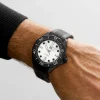 The luminescent white dial features a striking combination of white Super-Luminova® and black lacquer details, and a date display at 6 o’clock.
